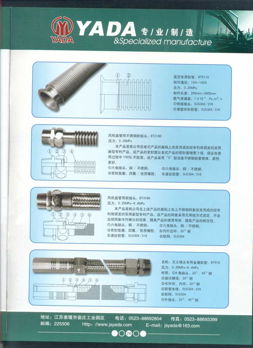 秉天時 籍地利 仰人和 虔誠一個永恒的理念,創(chuàng)新永續(xù).百諾不如一信,亞達人堅持以信為本,視客戶如同上帝,把對信譽的追求,體現在嚴格的質量控制和完善的客戶服務上,讓客戶百分之百滿意是亞達人不變的信念。 本廠系ISO9001質量認證企業、計量合格企業。本廠專業致力于生產不銹鋼金屬波紋軟管、超高壓、高壓膠管、波紋管補償器(膨脹節(jié))、立式、臥式、冷卻器。本廠產品具有承受壓力高、彎曲半徑小、抗疲勞性能強、使用壽命長等特點。廣泛應用于電力、石化、冶金、水泥建材、工程機械、礦山及液壓系統。產品暢銷全國各地。 今日亞達之成功源自諸多客戶的厚愛,明天的輝煌更離不開您對我的支持與信賴。查看更多>>